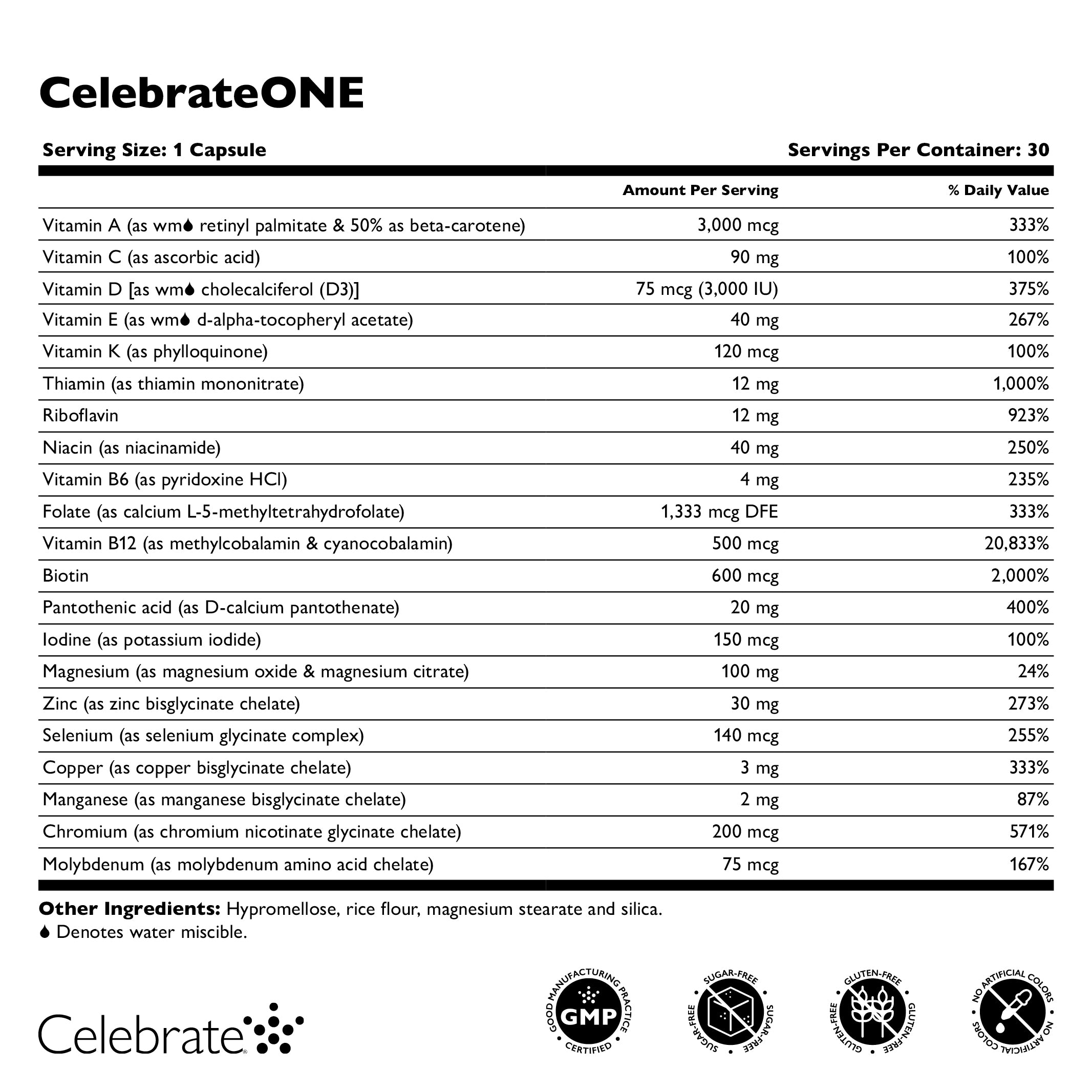 CelebrateONE est un multivitamine bariatrique complet qui ne nécessite qu'une seule dose par jour. Notre formulation répond aux recommandations de l'ASMBS pour les multivitamines et offre une biodisponibilité maximale, car nous avons soigneusement sélectionné chaque forme de vitamine et de minéral pour améliorer l'interaction et l'absorption. De nombreux suppléments apparaissent sur le marché, conçus uniquement pour être faciles à attirer les clients, en rognant sur la formulation. Notre réponse a été de créer CelebrateONE, un multivitamine en une seule dose sans compromis sur la qualité des vitamines et des minéraux ; CelebrateONE est disponible en tant que Gélule et en tant que A mâcher.